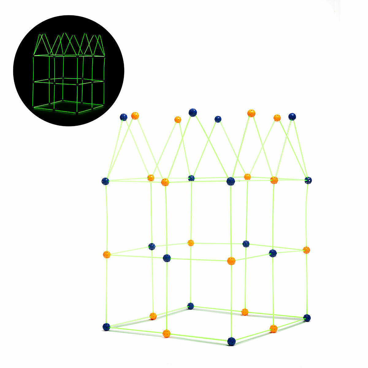 - Kit de construcción, 155 piezas: nuestro kit de construcción de fuertes incluye 55 bolas con orificios de conexión, 100 varillas fluorescentes, una tela de cobertura, bolsa de transporte para guardar y transportar todo cómodamente y evitar que las piezas se pierdan, y un manual con ilustraciones de ejemplos de construcciones.