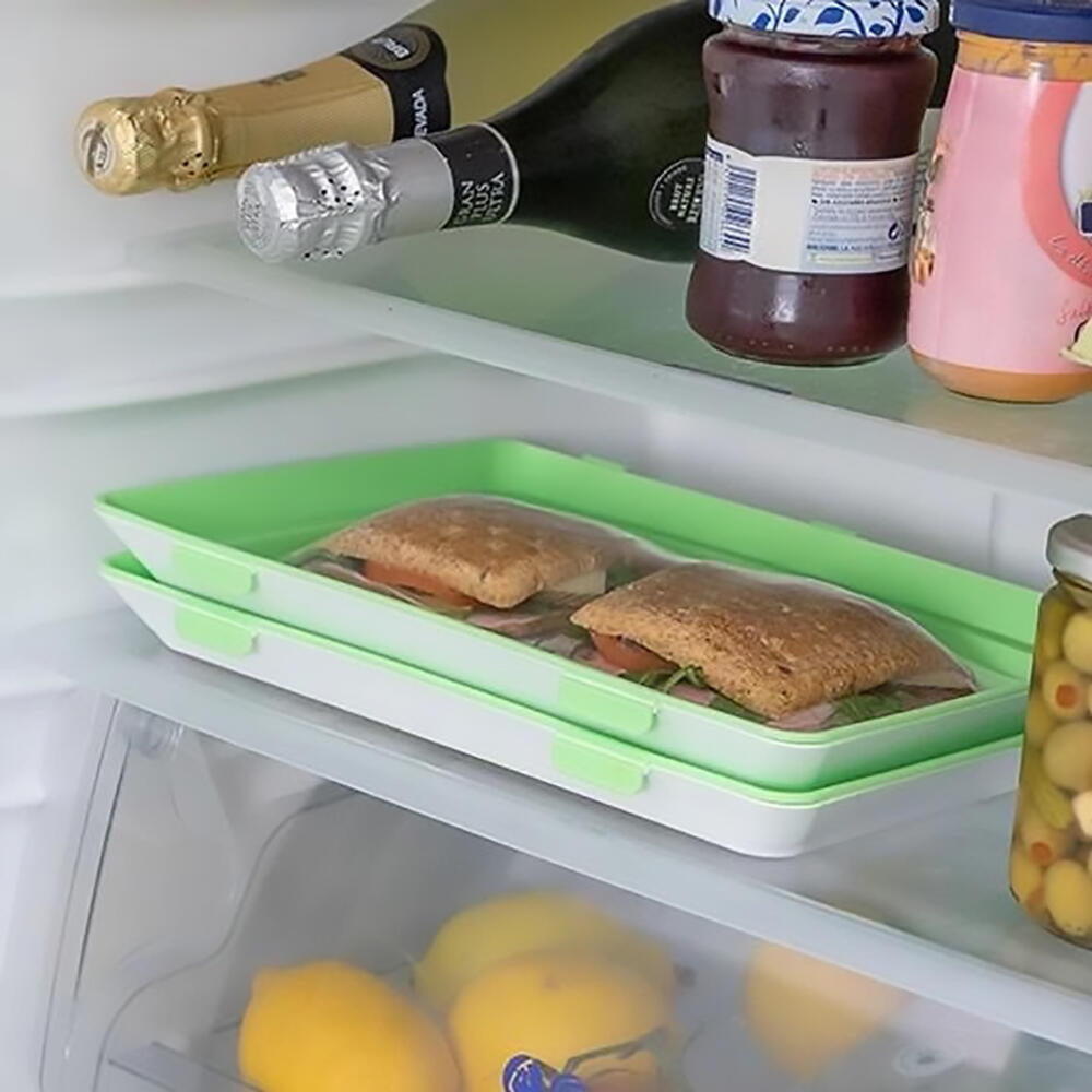 Diseño hermético y apilable – Su sistema de cierre semivacío evita fugas y olores, ocupando el mínimo espacio en la nevera.